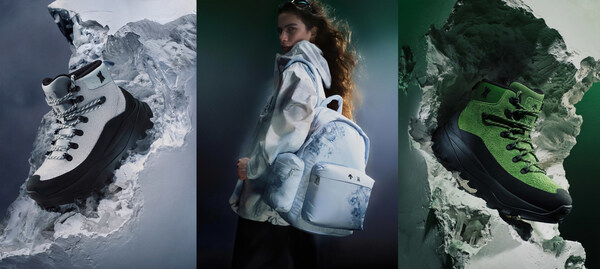 除服饰之外,此次联名亦推出鞋履、手套、背包、头盔与雪镜等延展单品,以统一的视觉语言延续整体调性。其中,冬季鞋履以牛反绒皮包覆材质结合艺术家标志性元素,兼顾造型感与实穿性能。鞋跟处特别融入呼应"未来遗迹"理念的空蚀式结构细节,以雕塑化的立体造型呈现时间侵蚀的视觉印记在雪场之外延续冰雪灵感,展现更具都市气质的冬日风格。